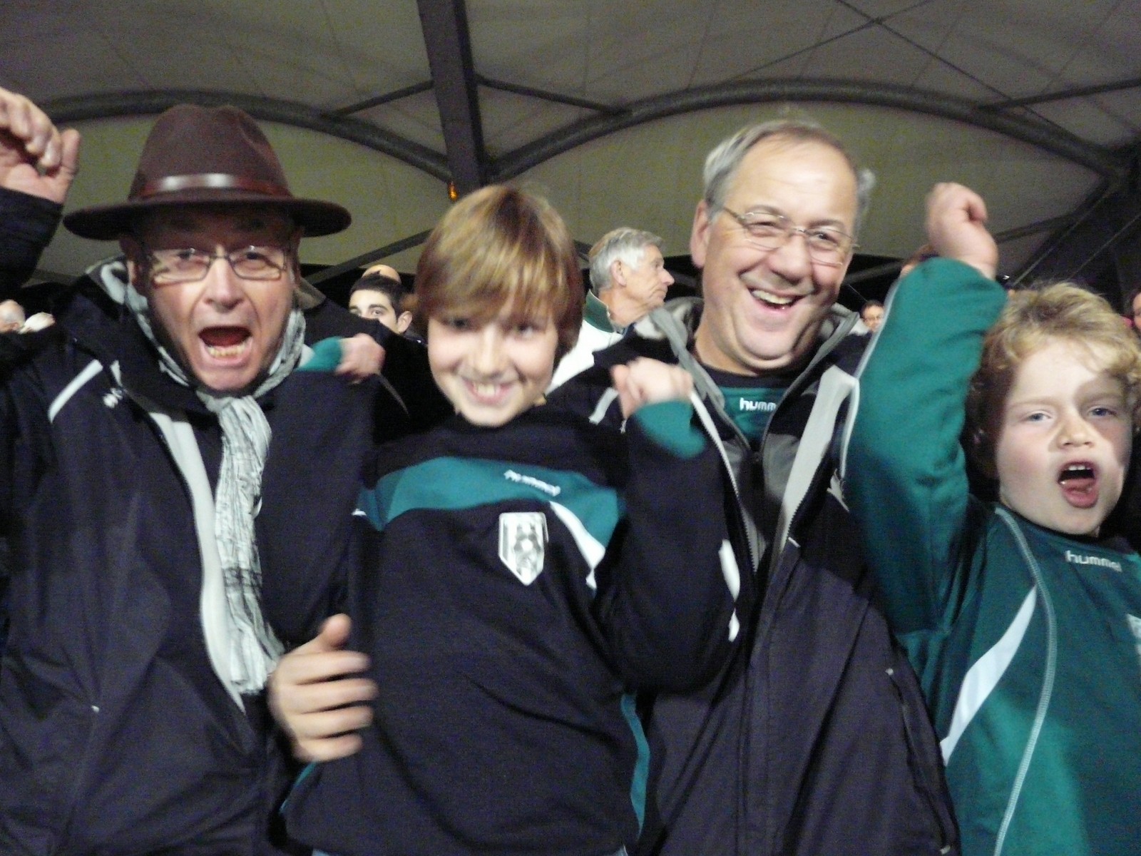 Et il y avait aussi du monde en tribune car le club s’était arrangé pour fournir des places aux U18, U13 et U15 qui le désiraient. Il reste quelques efforts à faire comme supporters car même avec un mégaphone, nos U18 étaient plutôt discrets !!!! Mais ils ont du se rattraper pendant le repas qu’ils avaient prévus ensemble à la sortie du match… Il n’y avait pourtant qu’à prendre exemple sur le président et le vice-président !!! Avec Colin et Noé M., ils sont à fond !
