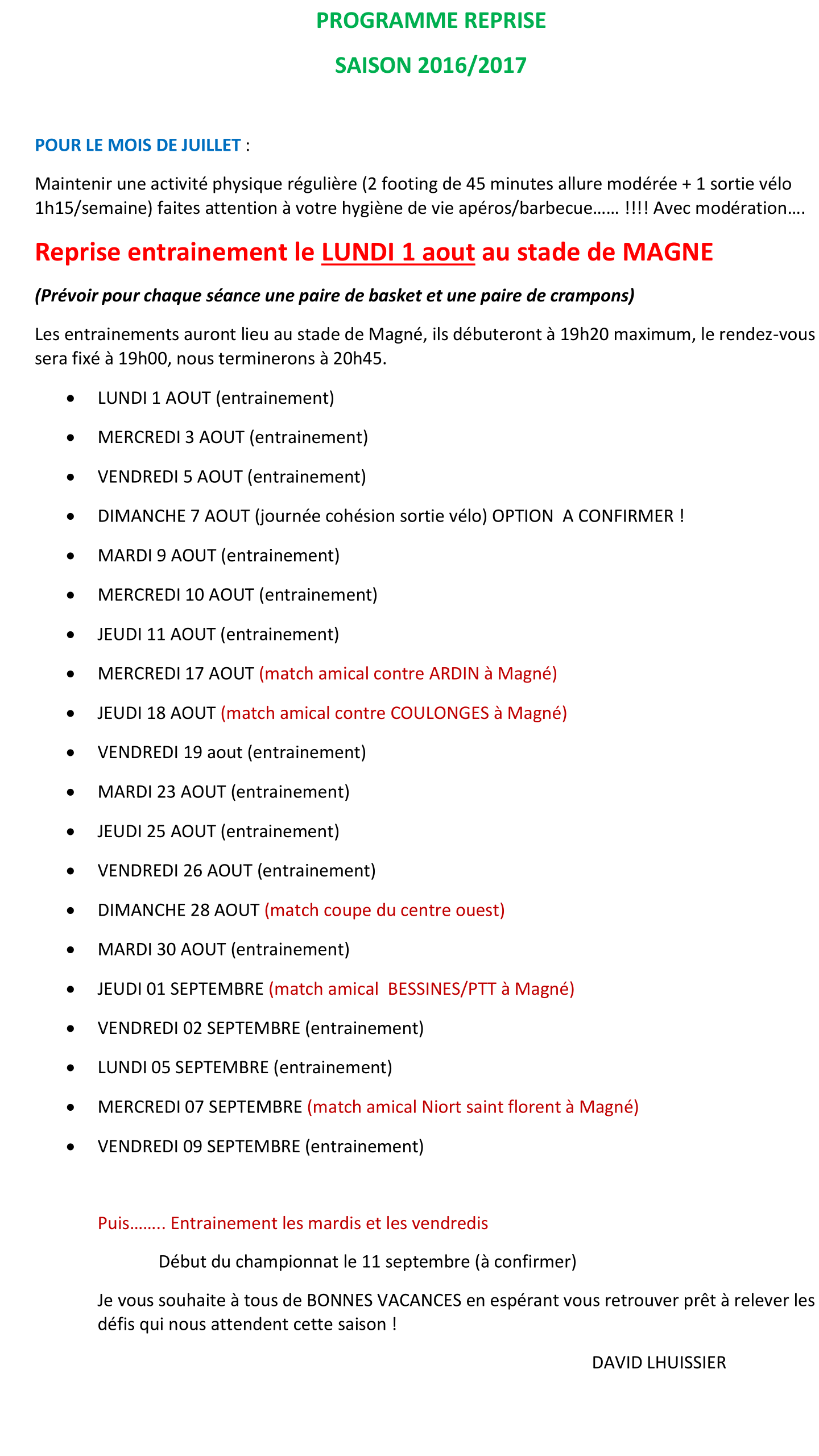 U6U7 – Samedi 03/09 à 10h au stade de Magné / U8U9 – Samedi 03/09 à 14h au stade de Magné / U10U11 – Mercredi 31/08 à 17h30 à Magné / U12U13 – Lundi 29/08 à 17h30 à Coulon / U14/U15 – Samedi 27/08 à 9h à Magné / U16/U17 – Lundi 15/08 à 17h30 à Villiers en plaine / Séniors – Lundi 01/08 à 19h à Magné (voir le planning complet)