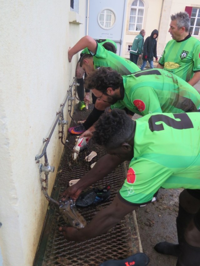 Pas facile de trouver un terrain de foot à St Eanne si vous ne savez pas que St Eanne est en réalité Le Breuil St Eanne. C’est dans ce lieu-dit qu’on trouve tout ce qu’il y a d’officiel, en particulier la mairie et surtout le terrain de foot. Enfin quand vous y arrivez, après bien des recherches, le match entre StEanne (5ediv)et la Venise en coupe Saboureau est déjà commencé depuis 10 minutes et vous avez loupé le premier but de Paul après un petit pont, drible et tir. Mais vous arrivez pile poil pour assister au tir canon de Thibault, après une remise en retrait de Paul. A ce moment vous apprenez des supporters assidus de l’équipe VV2, que la Venise mène déjà par 2 buts à 0. Et on ne joue que depuis un petit quart d’heure. Ce qui veut dire que les choses sont bien engagées. De fait, le jeu proposé par nos couleurs est plaisant. On essaie de construire sous l’impulsion du coach 2 Fred, en l’occurrence défenseur central, que le coach 1, Cyril, avait envoyé au charbon, afin d’être plus tranquille sur le banc de touche… Par moments, on se croirait en équipe de France (Tout est évidemment relatif)car la balle circule bien, malgré quelques petites ratées dont StEanne profite pour porter un semblant de danger dans nos lignes arrières vite annihilé par nos défenseurs en pleine confiance. Le ballon remonte, s’écarte sur les ailes. On est admiratif, mais cette dernière passe dans les pieds des adversaires sous les AH !AH ! AH ! des supporters désabusés nous remet dans la réalité. On n’est pas des pro, mais ça viendra peut-être ! car le canonnier de service Thibault vous envoie à la demi-heure de jeu, des 30 m, que dis-je des 35 m ! un boulet qui s’écrase sur la barre, rebondit sur le sol pour être repris par Clément L.qui de la tête inscrit le 3e but VV . A 3/0, la cause semble entendue et la fin de la mi-temps sera atteinte en roue libre, parfois même avec un peu trop de désinvolture… Ce dont profite st Eanne pour inquiéter quelque peu notre gardien avec ce tir qui frôle la barre.