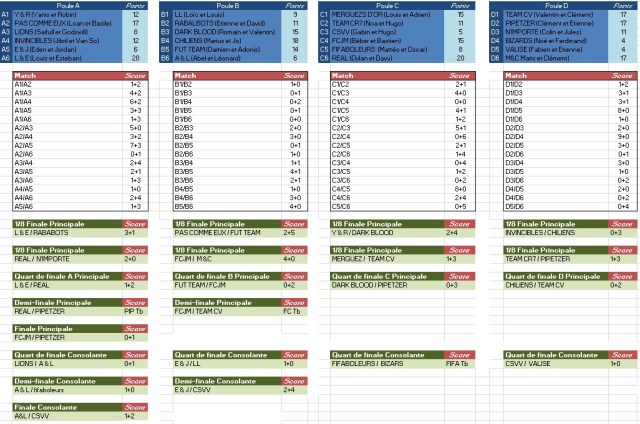 Et bien, ils l’ont fait !! Les « Pipetzer » (Etienne et Clément Pipet) remporte le tournoi Fifa CSVV 2017 pour la troisième année consécutive en s’imposant en finale contre le « FCJM » de Béber et Bastien sur le score de 1 but à 0 ! Une finale de haut niveau suivi par les quelques 50 spectateurs restés pour l’occasion. Des Pipetzer qui avaient bien failli passer à la trappe en demi-finale contre le « Réal » de Dylan et Davy, défaits aux tirs au but lors d’une séance de légende achevée sur le score de 14 à 13 !!!! Un peu plus tôt, « A&L » de Abel et Léonard avait du s’incliner en finale consolante face au « CSVV » (évidemment :) de Gabin et Hugo qui par deux fois ont su mener au score en assurant l’ouverture du score puis en éteignant les espoirs de leurs adversaires revenus à égalité en marquant rapidement un second but. Des bonbons pour tous les finalistes. Des T-shirts édition spéciale Tournoi Fifa CSVV seront remis aux finalistes de la phase finale principale lors de notre Assemblée générale.