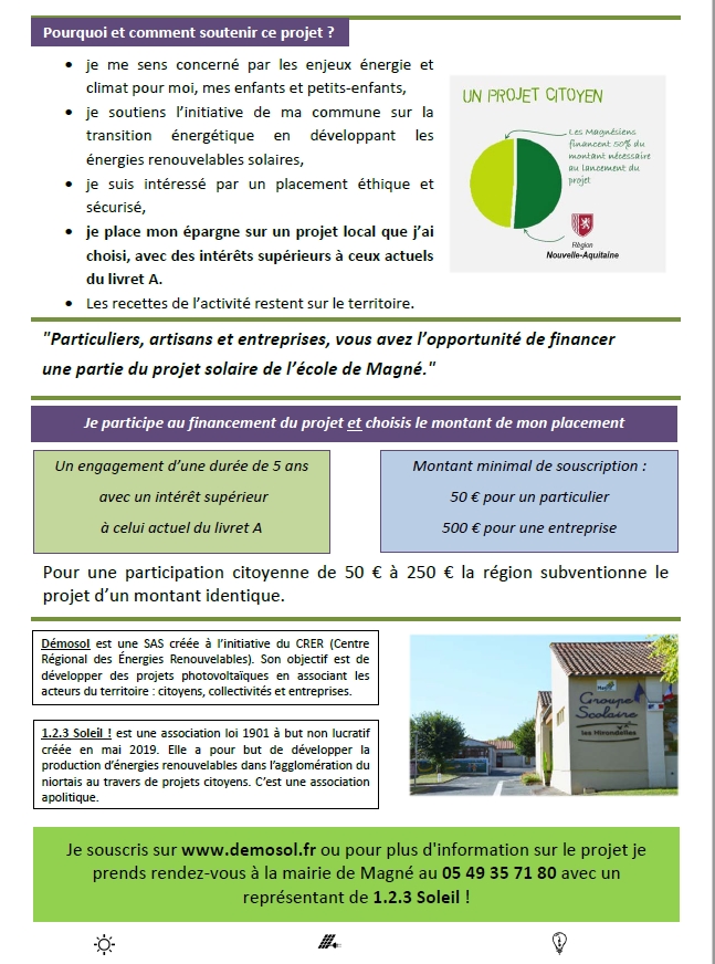 Vous êtes sensibles au développement des énergies renouvelables et vous souhaitez soutenir des projets communaux qui vont dans ce sens ? Vous ne diriez pas « non » à ce que vos impôts soient investis près de chez vous, en plus dans un projet écologique ? Alors ce projet est pour vous !