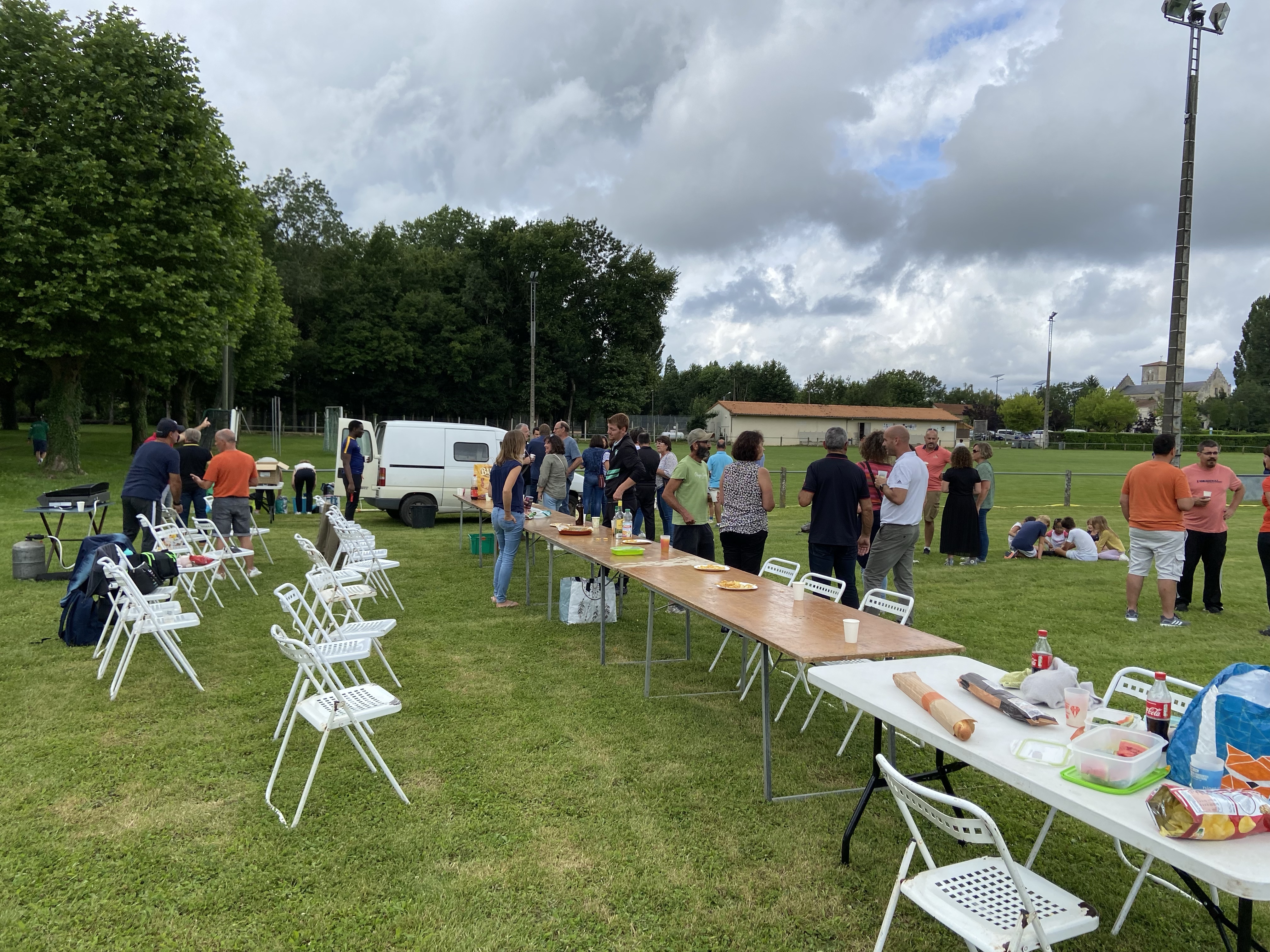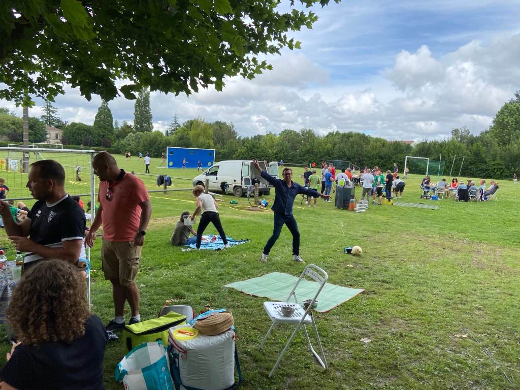 La journée s’est ensuite poursuivie au stade avec un apéro club puis un repas partagé très convivial. Une quarantaine de jeunes ont pu s’en donner à cœur joie tout l’après midi en tennis ballon, petits matchs, tirs au but… mais ce n’est pas encore cette année qu’ils l’emporteront pour autant dans le match parents enfants ! Remporté sur le fil 8 à 7 par les parents après quelques actions de légende !