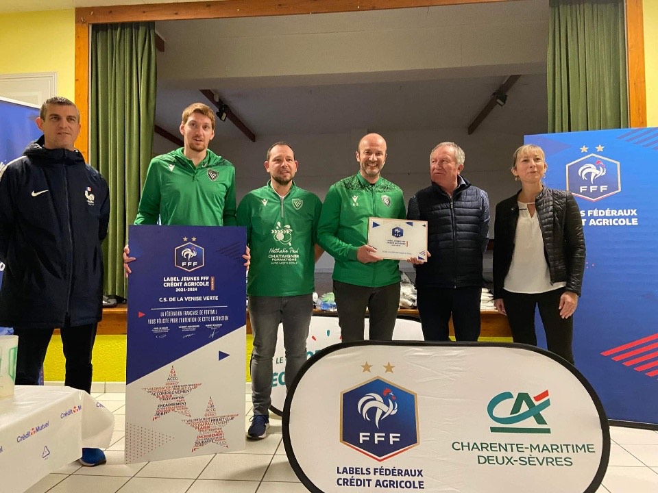 Elle a surtout été l’occasion de recevoir une belle récompense ! Pour cela Daniel GUIGNARD, Président du district de football des Deux-Sèvres, Jean-Marc LAVILLE, Conseiller technique et Stéphanie DESBAS, Directrice de l’agence du Crédit Agricole de Magné avaient tous faits le déplacement. Nous y avons officiellement reçu le LABEL JEUNES Niveau BRONZE pour notre Ecole de Foot !